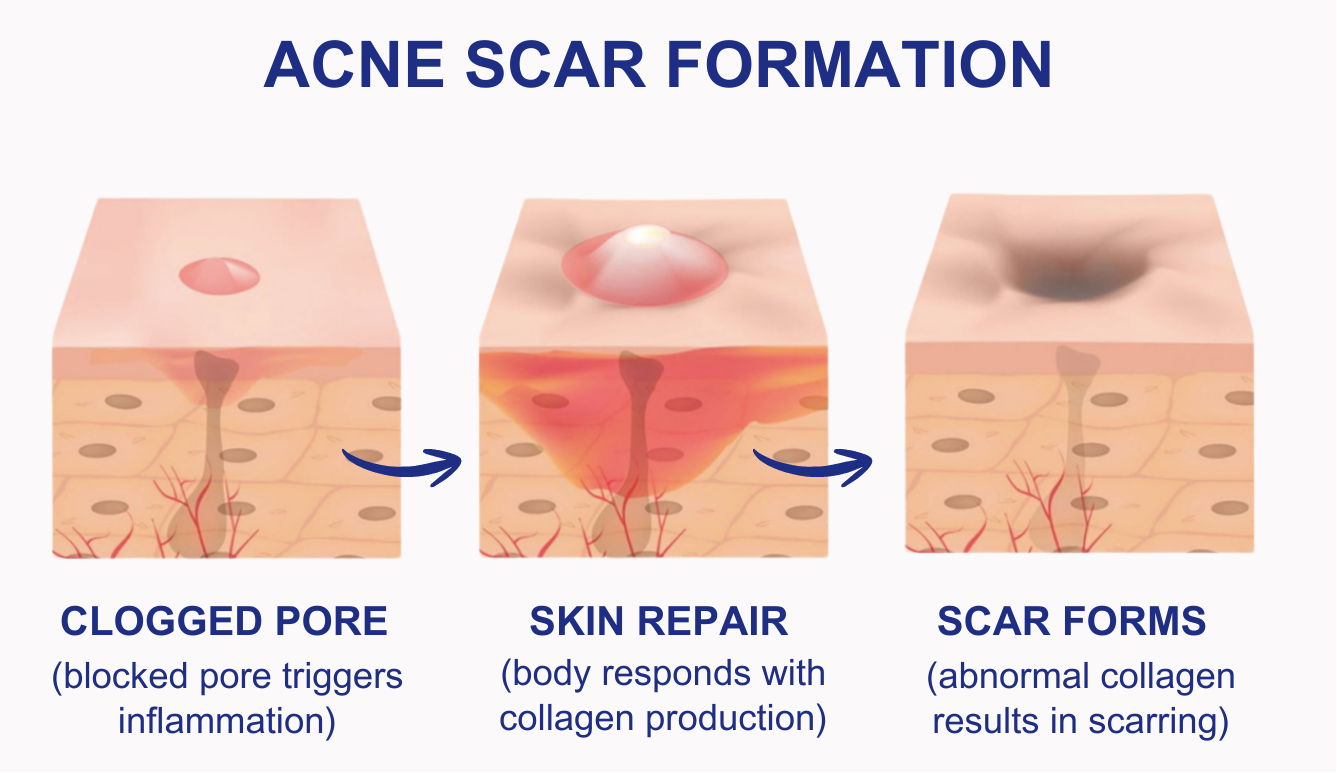 Acne scars form as part of the skin’s natural healing process. When inflammation damages the deeper layers of the skin, the body produces collagen to repair the area. Sometimes this process creates too little collagen, leading to indented scars, or too much, causing raised or thickened scars. To better understand this, we can break the process down into a simple 3-step sequence: