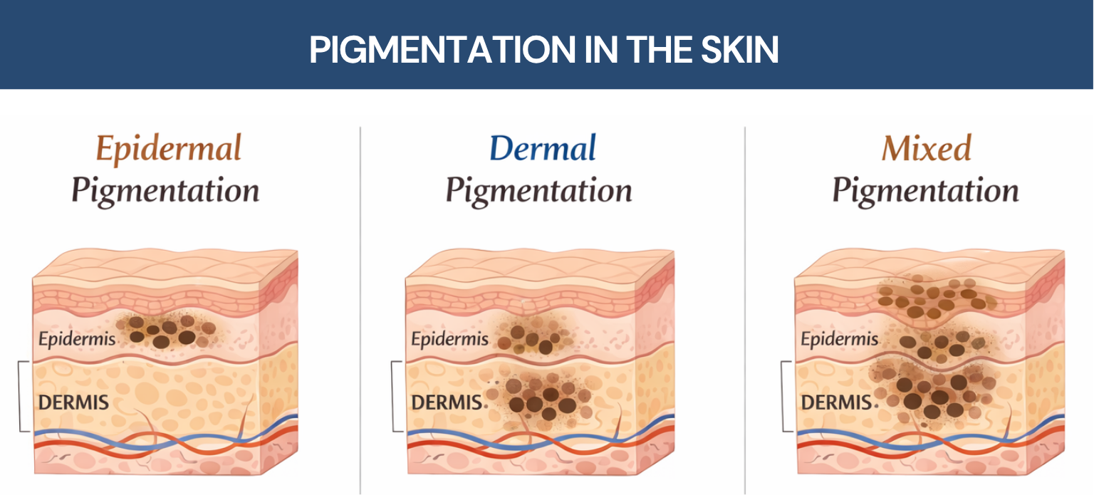 Epidermal pigmentation – Located in the basal layer of the epidermis → More responsive to skincare and superficial treatments